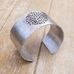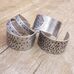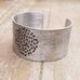 Minimalistinio stiliaus metalo apyrankė su iškaltomis raidėmis.