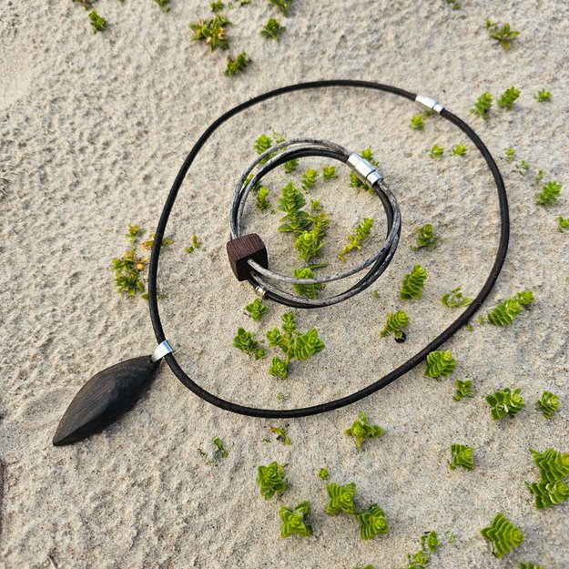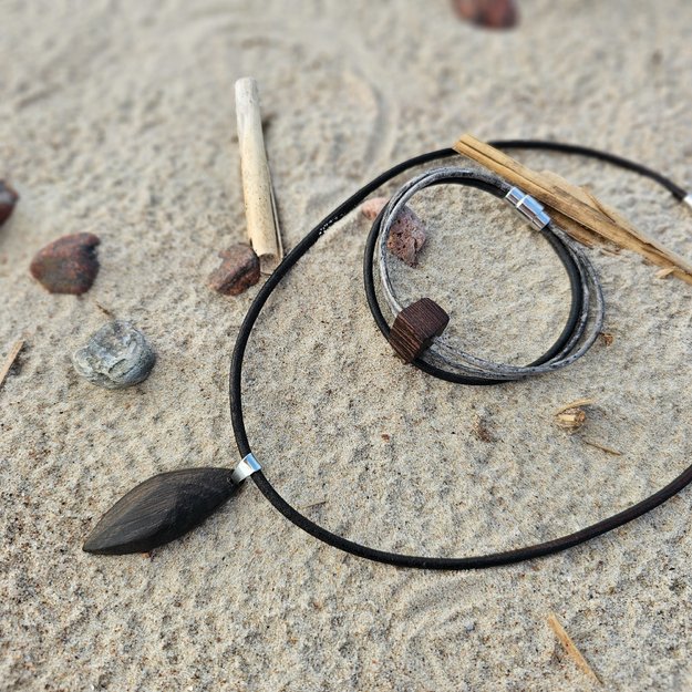 Tamsios spalvos juodojo ąžuolo (pragulėjusio jūroje kelis šimtus metų) pakabukas ant odinės virvelės. Medis pjaustytas, šlifuotas rankomis, impregnuotas natūraliu bičių vašku bei kokoso aliejumi. Užsegimas magnetinis.