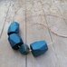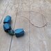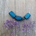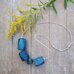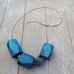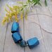 Koljė iš stambių mėlynos spalvos rankų darbo medžio karolių ant natūralios odos virvelės. Dekoruotas tamsinto sidabro spalvos metalo detalėmis, akmens karoliu. Medis pjaustytas, šlifuotas rankomis, impregnuotas natūraliu bičių vašku bei kokoso aliejumi.