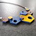 Apvalūs mėlyno veltinio stalo padėklai su metalo plokštelėje ranka iškaltu tekstu, lazeriu išpjausty..