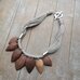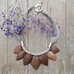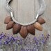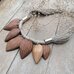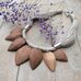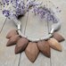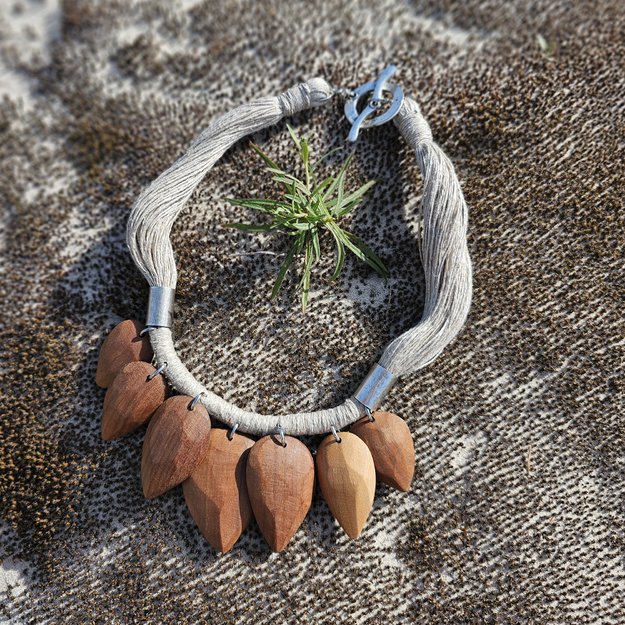 Stambių medinių rankų darbo lapelių formos karolių ir lino vėrinys, vertinančiai natūralumą ir išskirtinumą.