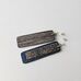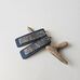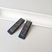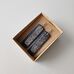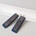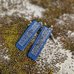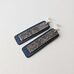 Stačiakampio formos auskarai iš mėlynos spalvos medžio lukšto (kita pusė - pilka). Medis klijuotas, pjaustytas, šlifuotas rankomis, impregnuotas natūraliu bičių vašku bei kokoso aliejumi. Dekoruoti tamsinto sidabro spalvos metalo detalėmis.