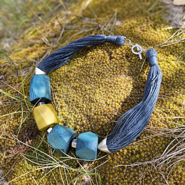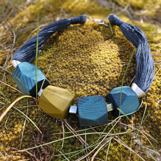 Vėrinys iš mėlynai ir žaliai dažyto medžio, dekoruotas tamsinto sidabro spalvos metalo detalėmis. Medis pjaustytas, šlifuotas rankomis, impregnuotas natūraliu bičių vašku bei kokoso aliejumi.