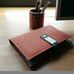 Rankų darbo veltinio knyga (A5) su natūralios odos užsegimu bei aliuminio plokštelėje ranka iškaltu tekstu.