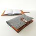 Knygutės viršelis pritaikytas standartinei A5 (17x24 cm) formato užrašų knygai ar darbo kalendoriui. Pagamintas iš patvaraus bei ilgaamžio 4 mm storio impregnuoto veltinio. Ant užsegimo metalo plokštelėje ranka iškaltas tekstas. Galima rinktis su lietuvišku tekstu: "idėjos / mintys / planai" arba anglišku "ideas / plans / thoughts." Taip pat galite pasirinkti net iš 4 spalvų: pilka, smėlio, ruda (plytų) bei mėlyna.