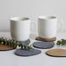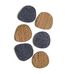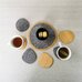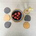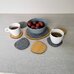 Minimalistinio stiliaus padėkliukai skirti arbatos ar kavos puodeliams. Pagaminti iš tvirto pagrindo, dengto natūraliu ąžuolo lukštu bei pilko 4 mm storio impregnuoto filco. Medis impregnuotas natūraliu bičių vašku bei aliejum. Rinkinį sudaro 6 skirtingi padėkliukai: 3 pagaminti iš medžio, 3 - iš filco (dirbtinio veltinio).