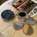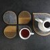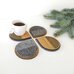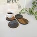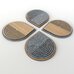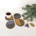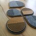 Minimalistinio stiliaus lašo formos padėkliukai skirti arbatos ar kavos puodeliui. Pagaminti iš tvirto pagrindo, dengto natūraliu ąžuolo lukštu bei pilko 4 mm storio impregnuoto filco. Medis impregnuotas natūraliu sėmenų aliejum. Rinkinį sudaro 4 padėkliukai. Galima įsigyti kartu su didesniu (19x19 cm) padėkliuku arbatiniui.