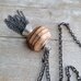 Zebrano medžio gabalėlis pjaustytas, šlifuotas rankomis, impregnuotas natūraliu bičių vašku bei kokoso aliejumi. Pakabukas dekoruotas grandinėlių kutu.