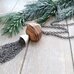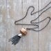 Minimalistinis pakabukas iš medžio ant ilgos tamsinto sidabro spalvos grandinėlės, vertinančiai natūralumą ir išskirtinumą.